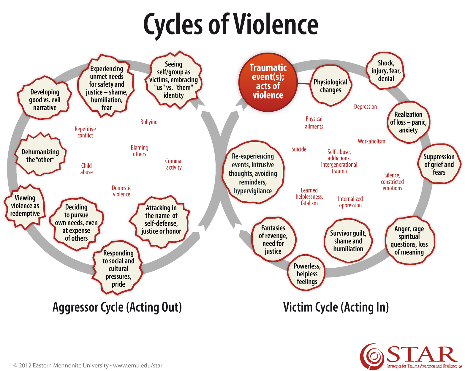 Even though we will experience trauma in our life, this doesn’t mean that we have to be traumatized in an ongoing way. Jerome and I experienced trauma  that day but we were were able to release the trauma energy and not have its effects persist in our life. Trauma not released and integrated into our life can get stuck in our individual body spirits and also in our collective body spirits. That stuck energy can wreak havoc on our bodies and spirits in the form of enduring stress or trauma reactions. I’m not going to go into all of varieties of stress or trauma reactions during this sermon. There’s a great handout from the Eastern Mennonite University’s trauma training that talks about how stuck trauma energy results in “acting out” behaviors, meaning aggression and violence against others like bullying, criminal activity, blaming others, viewing violence as redemptive. Or it can result in “acting in” behaviors, aggression or violence against ourselves like depression, learned helplessness or fatalism, internalized oppression. The handout is called “Cycles of Violence,” because unless the trauma is interrupted and healed, it will keep on getting passed along.
