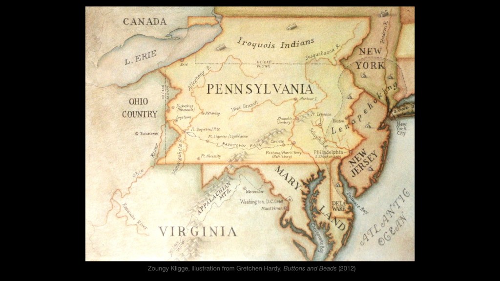SHERI: My ancestors had now been settlers in Northkill for almost 20 years. Initially, relations between the European settlers and the Lenni Lenape were good due to William Penn’s values of treating the Native people fairly. But these good relations fell apart after the Walking Purchase and other acts of colonial treachery. Repeatedly, European settlers encroached on the territory of the Lenni Lenape, who were pushed further and further into the western part of Pennsylvania and Ohio Country. There, the Lenni Lenape allied with the French, who had claimed the Great Lakes and the whole valley of the Ohio and Mississippi Rivers. For their part, the English made an alliance with the Iroquois, historic enemies of the Lenni Lenape. The so-called “French and Indian War” had begun, which was essentially a war between two colonial powers who used the Native people and European settlers as pawns in their own power struggles.