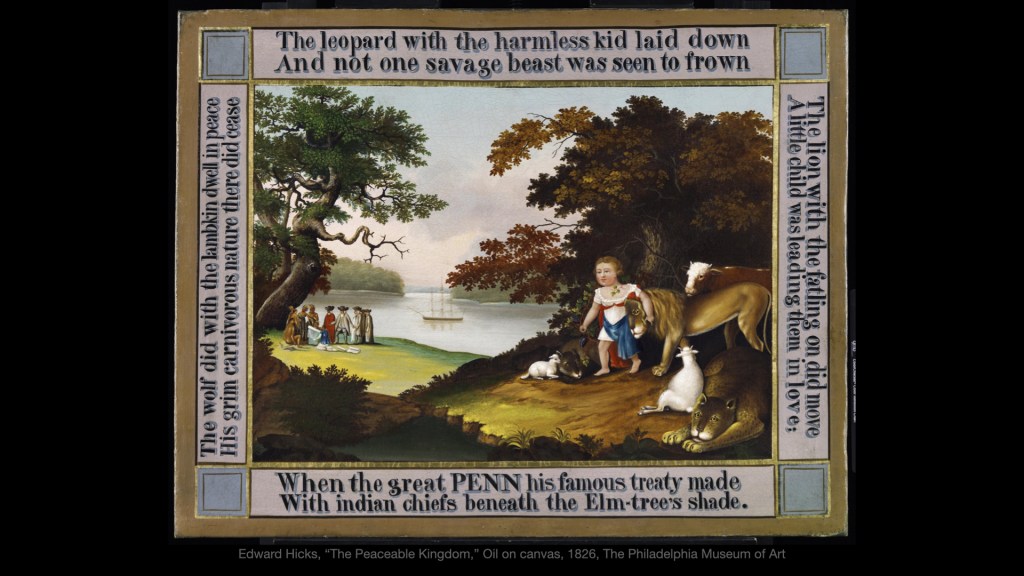 LISA: Edward Hicks was a Quaker sign painter in Pennsylvania, who lived from 1780-1849. He is known for painting dozens of versions of The Peaceable Kingdom. As you can see in this one, the animals on the right represent the scripture we heard earlier, adapted into a poem around the left, top, and right of the painting. The figures on the left, and the last line below the painting, represent William Penn and a few other Quakers signing a treaty with the Lenni Lenape people. So Hicks draws a parallel between Isaiah’s prophecy of a peaceful co-existence of predator and prey animals, and of that between settlers and native peoples in Penn’s Holy Experiment.