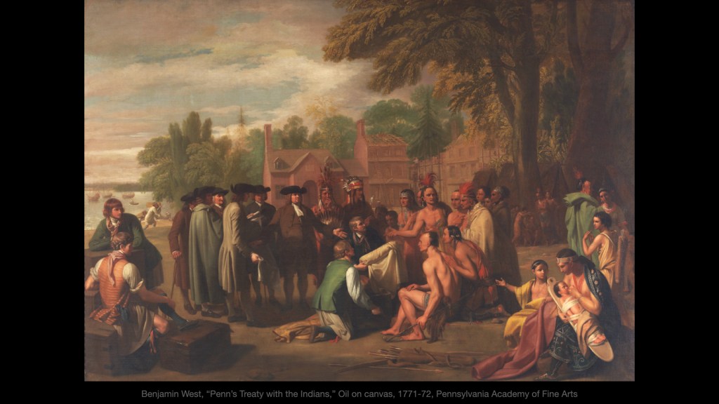 This painting by another Quaker artist, Benjamin West, is the source Hicks used for the treaty scene. It was commissioned by Penn’s son Thomas in about 1771, long after Thomas and his brothers had converted to Anglicanism and turned their backs on the fair dealing that their father had been known for.