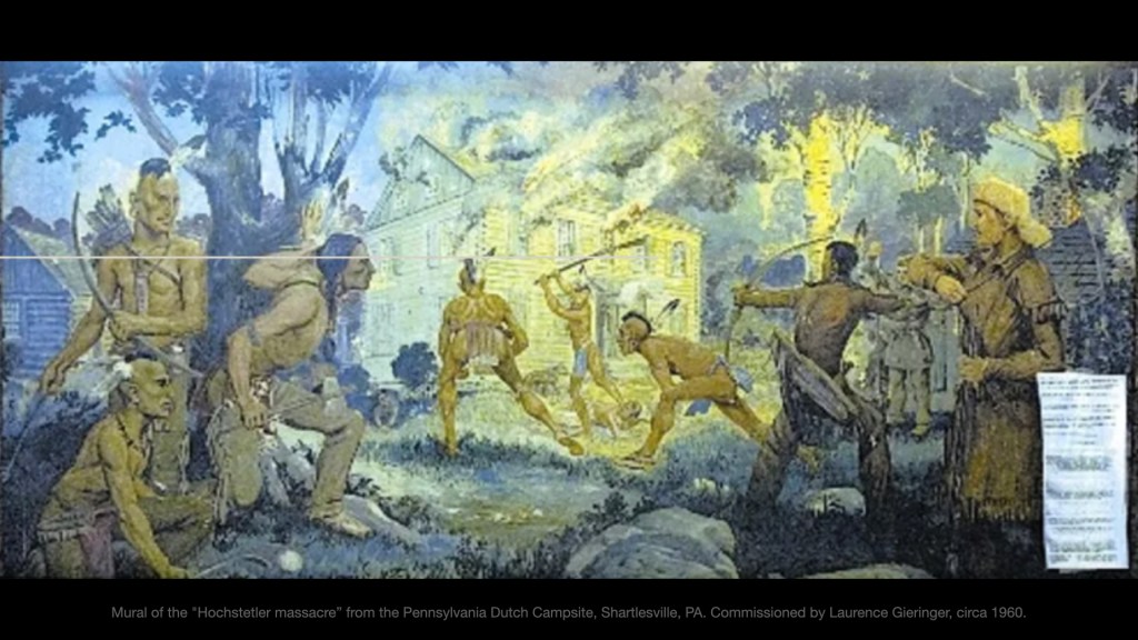 While the terrorism of the Paxton boys is easy to denounce and the Mennonites’ pacifist innocence easy to assert, my friend Tim Nafziger has said that “a deeper analysis calls us to reckon with the preferential treatment Mennonites received when it came to fertile land access and eventual property ownership. Mennonite settlers reaped the benefits as Indigenous peoples’ lands were taken out from under them and as other refugee groups like the Scots-Irish served as strategic buffers. Indeed, the Paxton boys’ very acts of violence may have further insulated Mennonites from the brunt of hostilities arising from their occupation of Native lands. I hope we can see how overt acts of terrorism like the Conestoga Massacre can mask deeper layers of violence.”