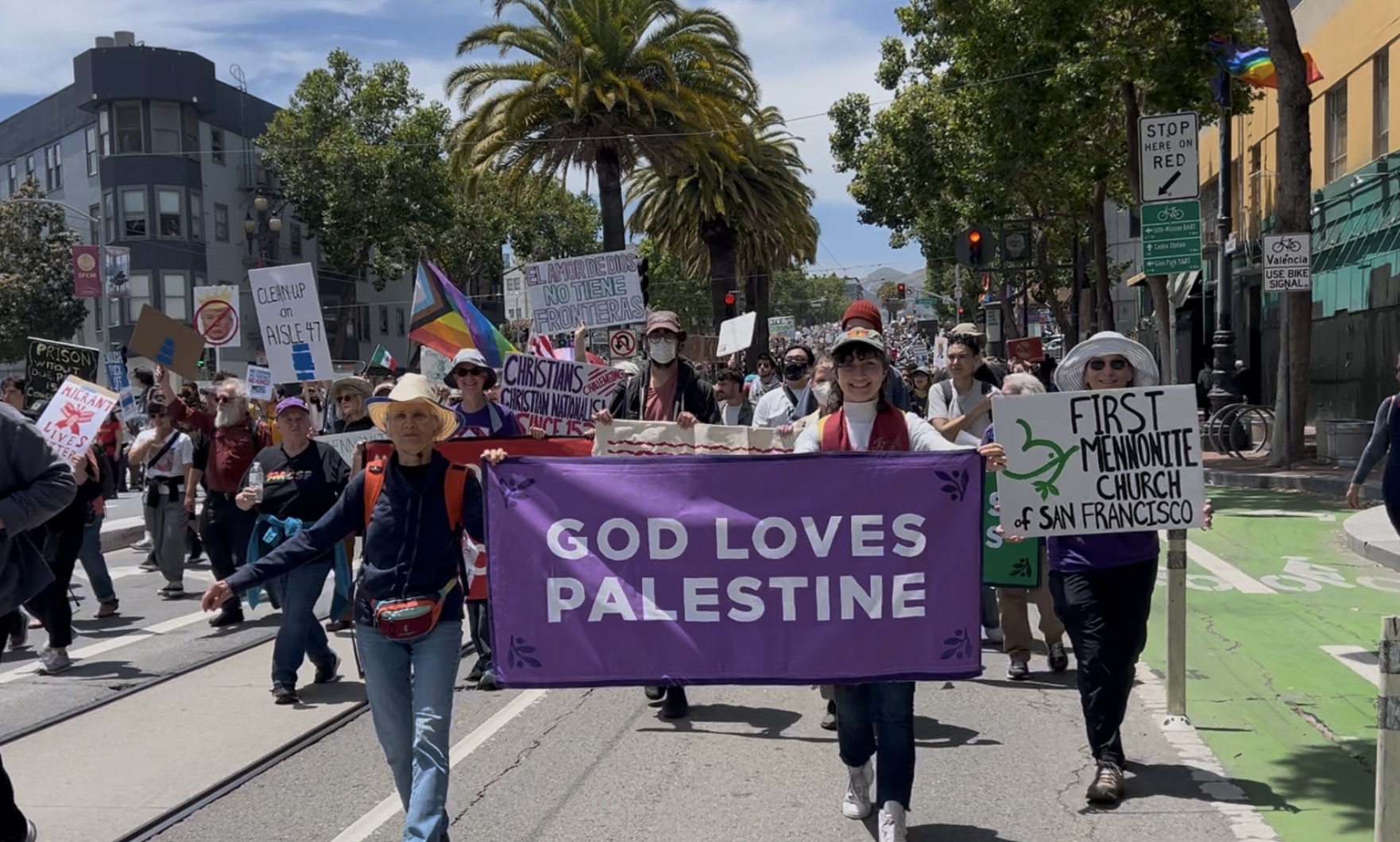 Mennonite Action Bay Area contingent at No Kings March in San Francisco, June 14, 2025.